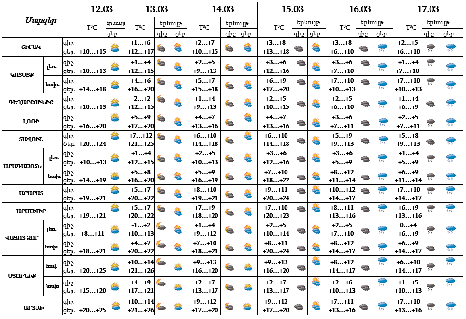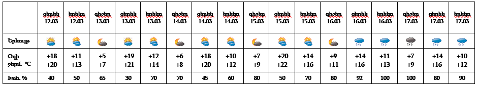 Քամին՝ հարավարևմտյան 2-4 մ/վրկ արագությամբ, մարտի 13-15-ն առանձին վայրերում սպասվում է քամու ուժգնացում 12-15մ/վրկ:
