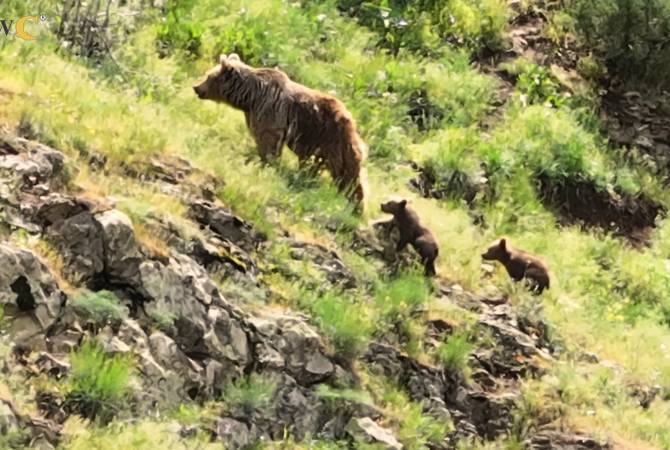Օրերս տեսախցիկները նկարահանել են, թե ինչպես է մայր գորշ արջն ապահով շրջում իր ձագերի հետ Կովկասյան կենսաբազմազանության ապաստարանի (CWR) տարածքում։
