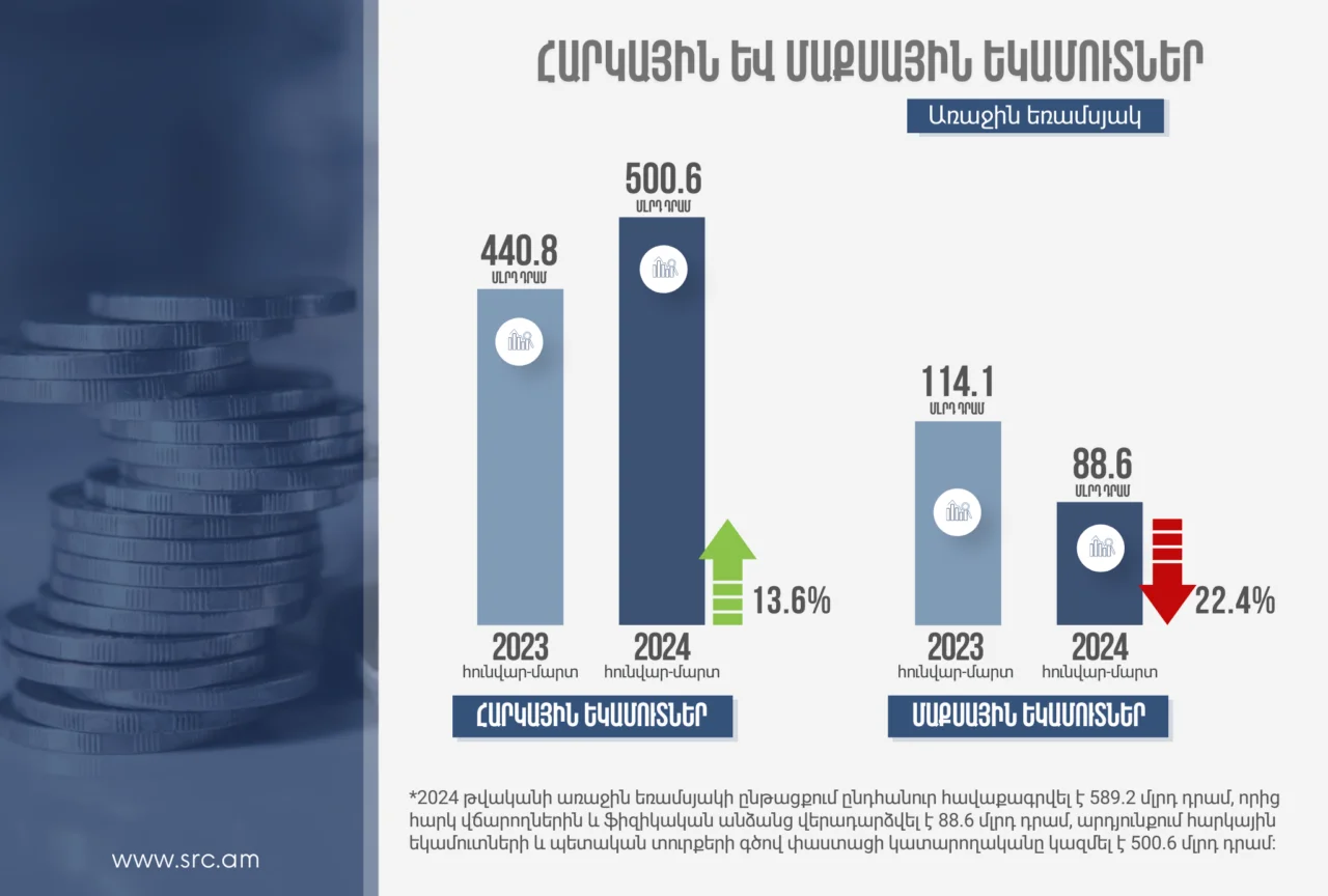Միաժամանակ, կոմիտեն հայտնում է, 2024 թվականի առաջին եռամսյակի ընթացքում հարկային և մաքսային մարմինների կողմից ընդհանուր հավաքագրվել է 589.2 մլրդ դրամ, որից հարկ վճարողներին և ֆիզիկական անձանց վերադարձվել է 88.6 մլրդ դրամ։ Արդյունքում՝ հարկային եկամուտների և պետական տուրքերի գծով փաստացի կատարողականը կազմել է 500.6 մլրդ դրամ, ինչը նախորդ տարվա նույն ժամանակաշրջանի համեմատ ավելի է 39.3 մլրդ դրամով կամ 8.5%-ով: