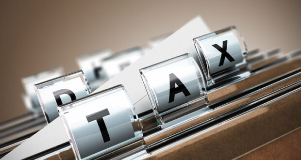 Folder tab with the word tax, beige background. Taxes concept for illustration of taxation.