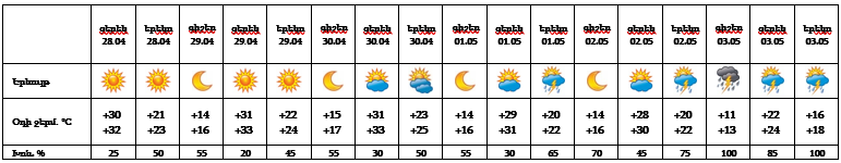 Երևանում ապրիլի 29-30-ին սպասվում է առանց տեղումների եղանակ։ Մայիսի 1-2-ի երեկոյան ժամերին հնարավոր է կարճատև անձրև և ամպրոպ, 3-ին՝ ժամանակ առ ժամանակ սպասվում է անձրև և ամպրոպ, ամպրոպի ժամանակ՝ քամու ուժգնացում 15-18մ/վ արագությամբ։