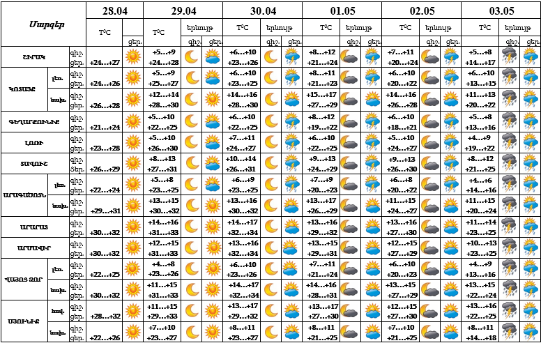 «Քամին՝ հարավարևելյան՝ 2-5մ/վ, ամպրոպի ժամանակ սպասվում է քամու ուժգնացում 15-20մ/վ արագությամբ: Օդի ջերմաստիճանն ապրիլի 29-30-ին աստիճանաբար կբարձրանա ևս 2-4 աստիճանով, մայիսի 1-3-ի ցերեկը աստիճանաբար կնվազի 7-9 աստիճանով»,- ասվում է հաղորդագրության մեջ։