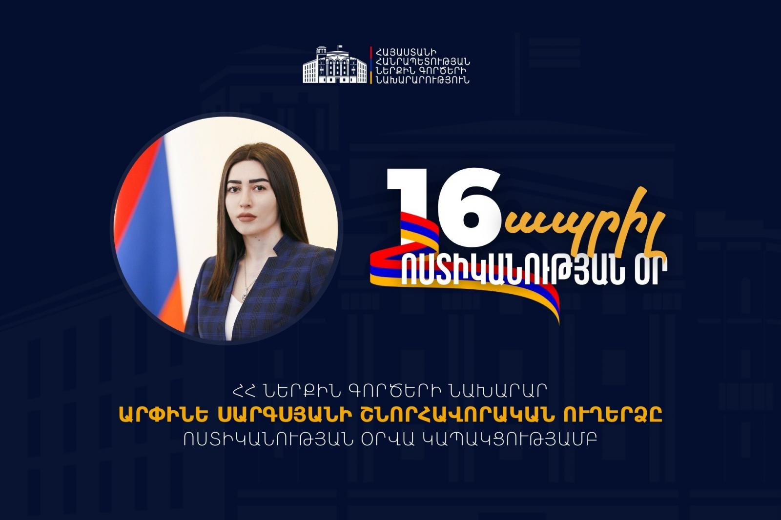 Հայաստանի Հանրապետության ներքին գործերի նախարար Արփինե Սարգսյանը Ոստիկանության մասնագիտական տոնի առթիվ շնորհավորական ուղերձ է հղել: