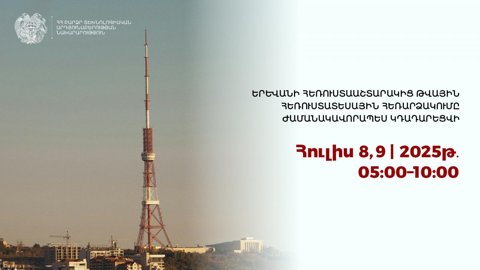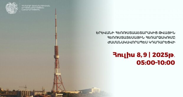 Երևանի հեռուստաաշտարակի գեղազարդ լուսավորման նոր համակարգի մոնտաժային աշխատանքներով պայմանավորված՝ 2025 թվականի հուլիսի 8-ին և 9-ին առավոտյան ժամը 05:00–10:00-ն Երևանի հեռուստաաշտարակից թվային հեռուստատեսային հեռարձակումը ժամանակավորապես կդադարեցվի։