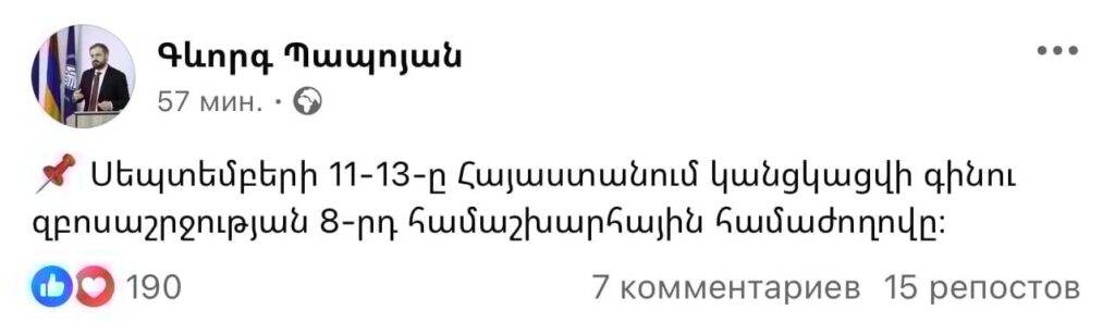 Սեպտեմբերի 11-13-ը Հայաստանում կանցկացվի գինու զբոսաշրջության 8-րդ համաշխարհային համաժողովը։ Այս մասին գրել է ՀՀ Էկոնոմիկայի նախարար Գևորգ Պապոյանը իր ֆեյսբուքյան էջում։