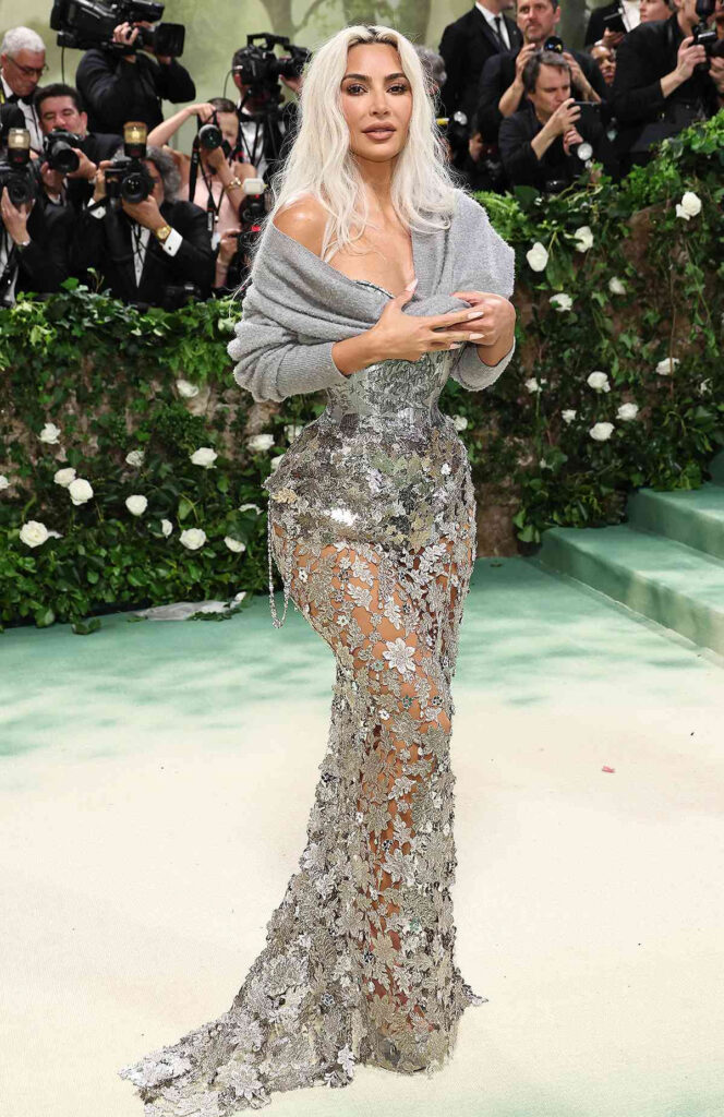 Քիմ Քարդաշյանը կրել է զգեստ՝ զարդարված մետալիկ ծաղիկներով: «Maison Margiela»-ի զգեստն ընդգծել է աստղի չափազանց նեղ իրանը: