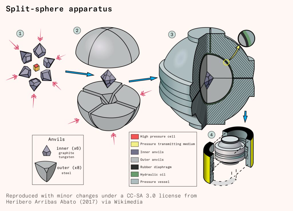 Որպես ելանյութ օգտագործվել է ադամանտանը՝ ածխաջրածին՝ կմախքային կառուցվածքով, որի հիմքում ընկած է ածխածնի ատոմների նույն տետրաէդրիկ կմախքը, ինչպես ադամանդի դեպքում։ Ադամանտանի մոլեկուլում ածխածինները գտնվում են «ադամանդանման» դասավորությամբ, բայց յուրաքանչյուրը կապված է ջրածնի ատոմների հետ։ Ադամանտանը ադամանդի վերածելու համար անհրաժեշտ է հեռացնել ջրածինները և միացնել ածխածինները միմյանց հետ։ Դրա համար հետազոտողները էլեկտրոնների փունջ են կիրառել լուսատեսային էլեկտրոնային մանրադիտակում։