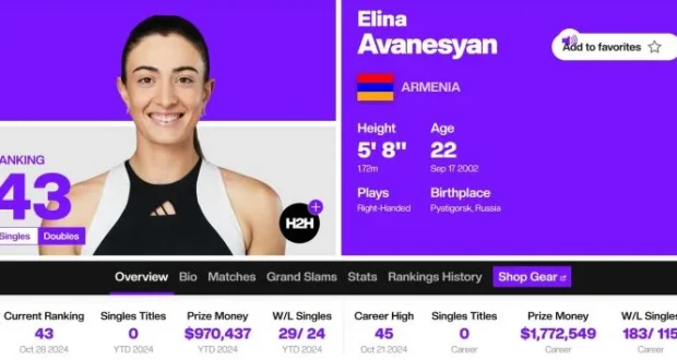 WTA. Էլինա Ավանեսյանն առաջին անգամ 43-րդ տեղում է